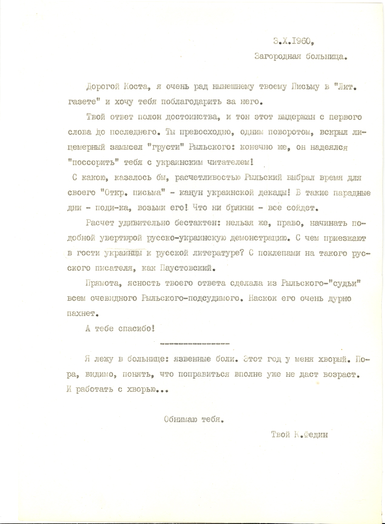 Константин Паустовский в своих воспоминаниях, составленных по случаю юбилея Федина, намеренно подчеркивает личностные качества титулованного собрата по перу и рассказывает о нем как